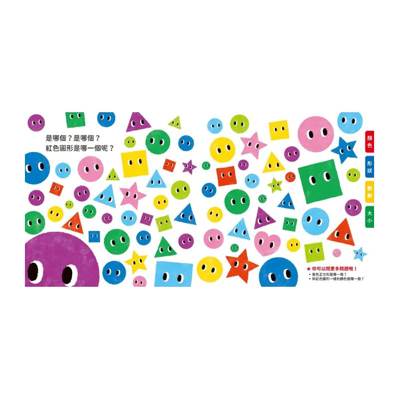 全套含兩本書《紅色圓形是哪個?》和《紅色圓形有幾個?》,從書名「是哪個」和「有幾個」可知一本以顏色和形狀入門,一本從數數切入主題。《紅色圓形是哪個?》最開始先認識「紅色」是哪一個、「圓形」是哪一個;有了「1個」的基本概念之後,再逐頁增加不同顏色、形狀和大小的數量,直到最後一頁挑戰的是從60多個不規則排列的圖形中,找出並回答指認的問題。