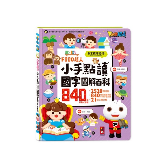 《FOOD超人小手點讀國字圖解百科》精選出21種主題分類,內含840個國字與國字小知識,除了可以認識國字之外,同時也可以聆聽小知識,理解國字的由來或者是字的意思與解釋,讓孩子能 夠在故事中聽發音,同時輕鬆學國字。