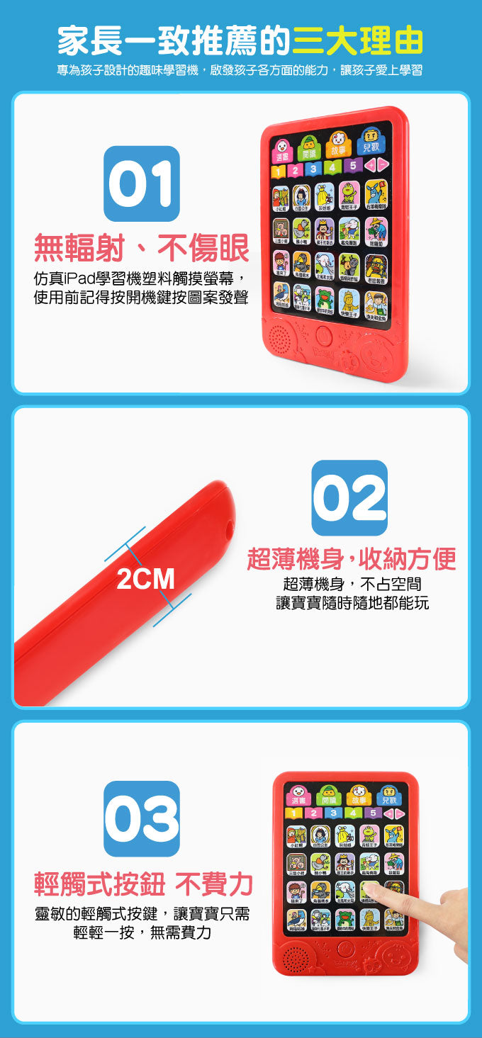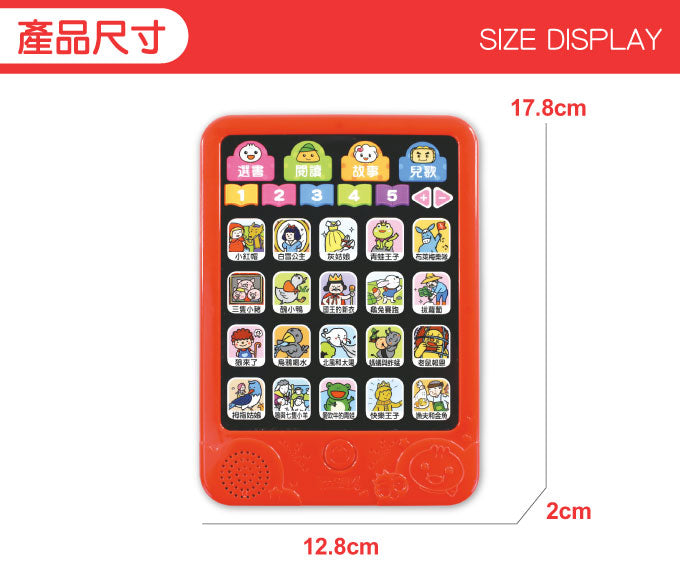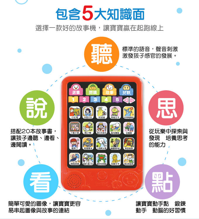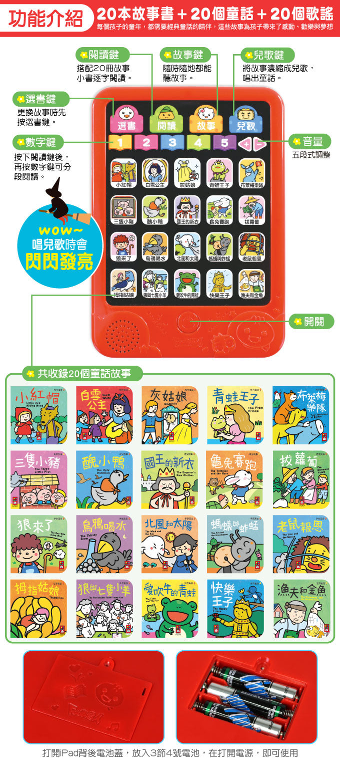 ★內容物: 平板故事機、20本故事小小書、歡唱兒歌手冊、三顆AAA電池、厚磅手提外盒★商品內容收錄: