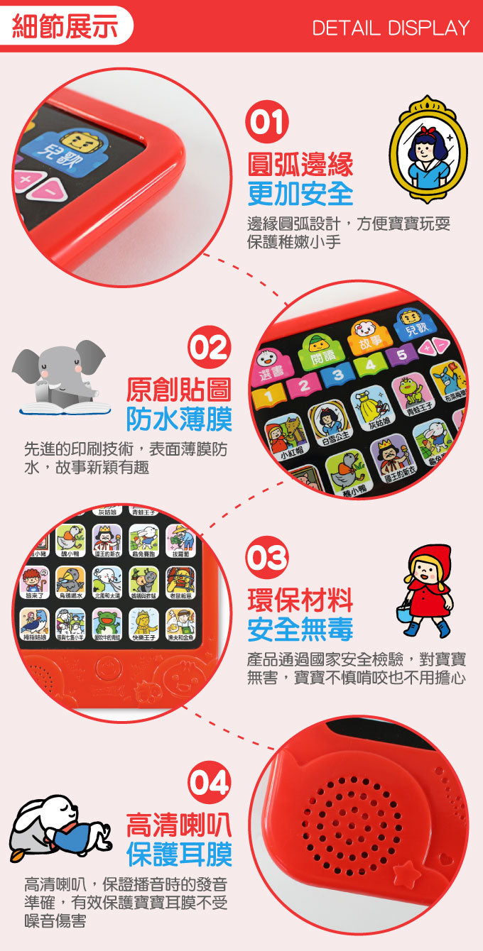 「幼兒平板童話故事機」收錄20個最經典的童話故事,陪伴孩子成長,帶來歡樂、希望與夢想。