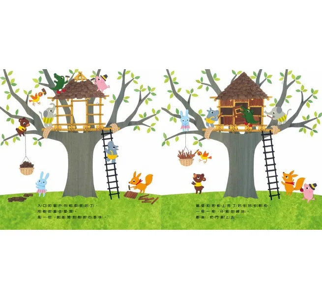 河馬啵啵和動物村的好朋友們,同心協力在樹上蓋起了漂亮的木屋,