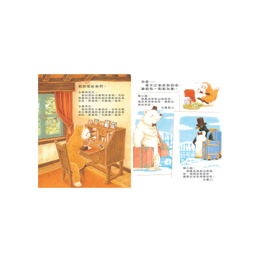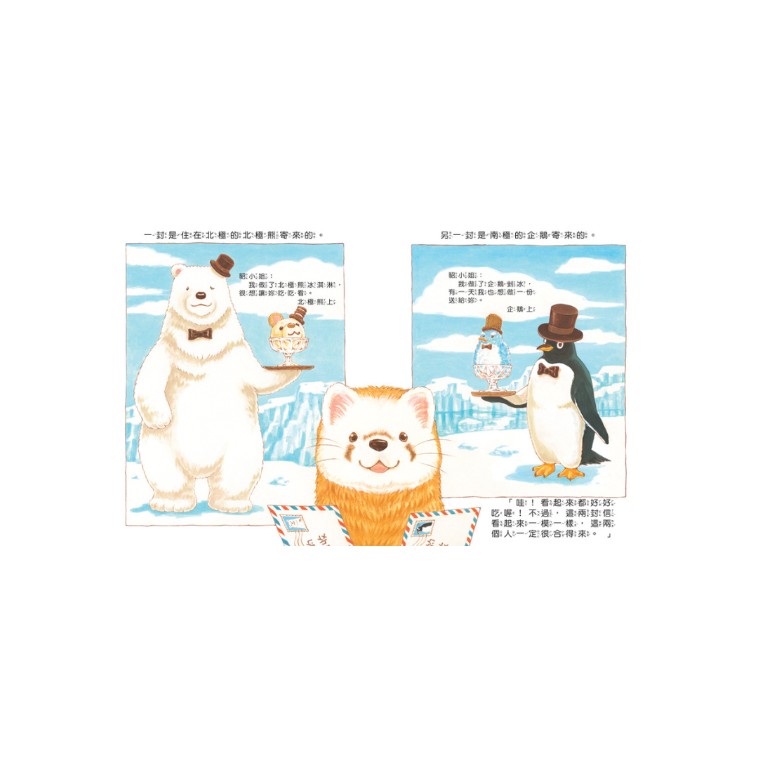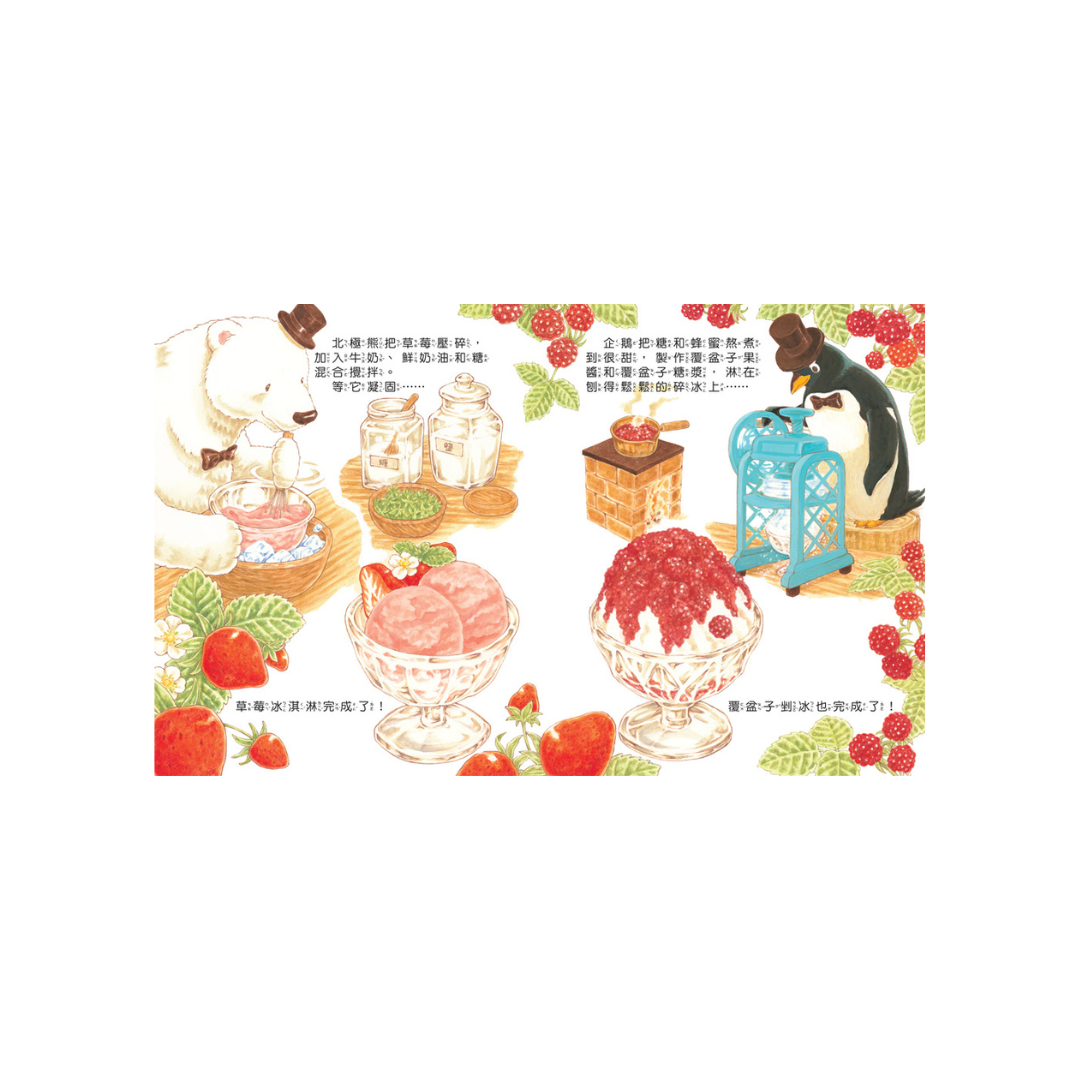 有一天,貂小姐分別收到了北極熊和企鵝的來信,他們要來到咕咕山上,創造出好吃的冰淇淋和剉冰,動物們同心協力搬運很多冰塊和食材。但是……貂小姐卻生氣了,究竟發生了什麼事情呢?他們最後又會做出什麼樣的創意美食,讓大家大排長龍呢?