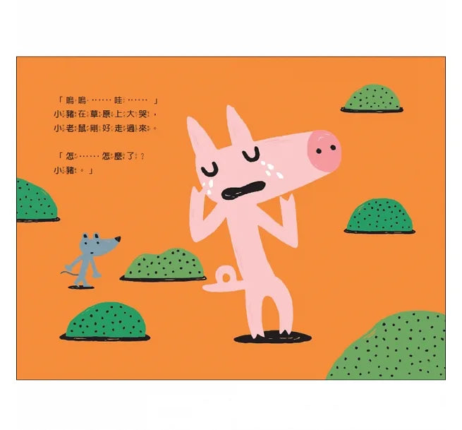 「嗚嗚……哇……」有一隻小豬在草原上大哭。這時小老鼠剛好走了過來。小老鼠問小豬怎麼了,小豬說:「就是那個……大野狼拿著烤地瓜說要換我手上的御飯糰,我說好,大野狼不但沒有把烤地瓜給我,還把我的御飯糰一口吃掉了,真的好過分……」小老鼠聽完之後,就跟小豬說:「好,我去找人來幫忙!」,說完就飛快的跑走了。