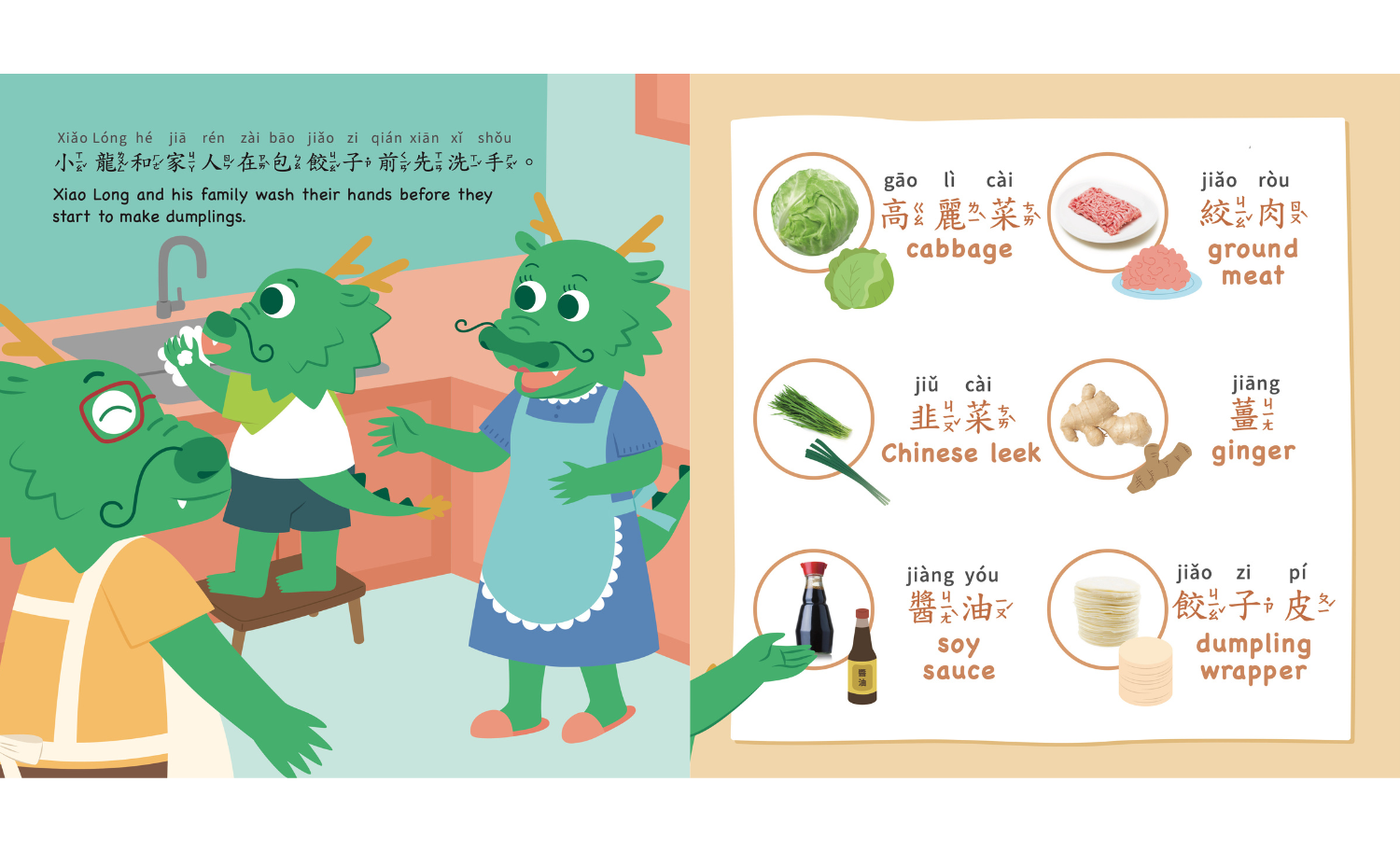 In this bilingual Chinese-English board book, Xiao Long and his family gather all the ingredients needed to make dumplings. Follow them step-by-step, and if you make dumplings yourself, make sure to ask a grown up for help! Practice key words and concepts when it comes to making dumplings – the ingredients we use, the utensils needed, and the way we cook them – and learn with a fun and engaging “Find That Item” activity on every spread.