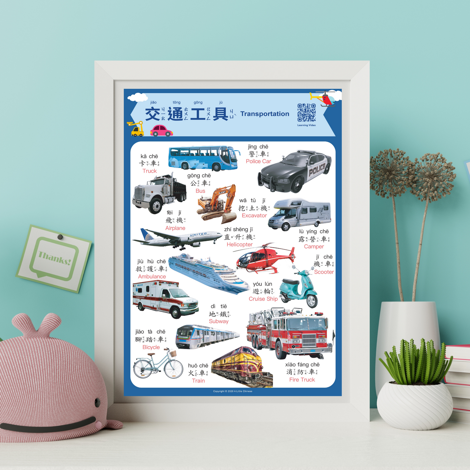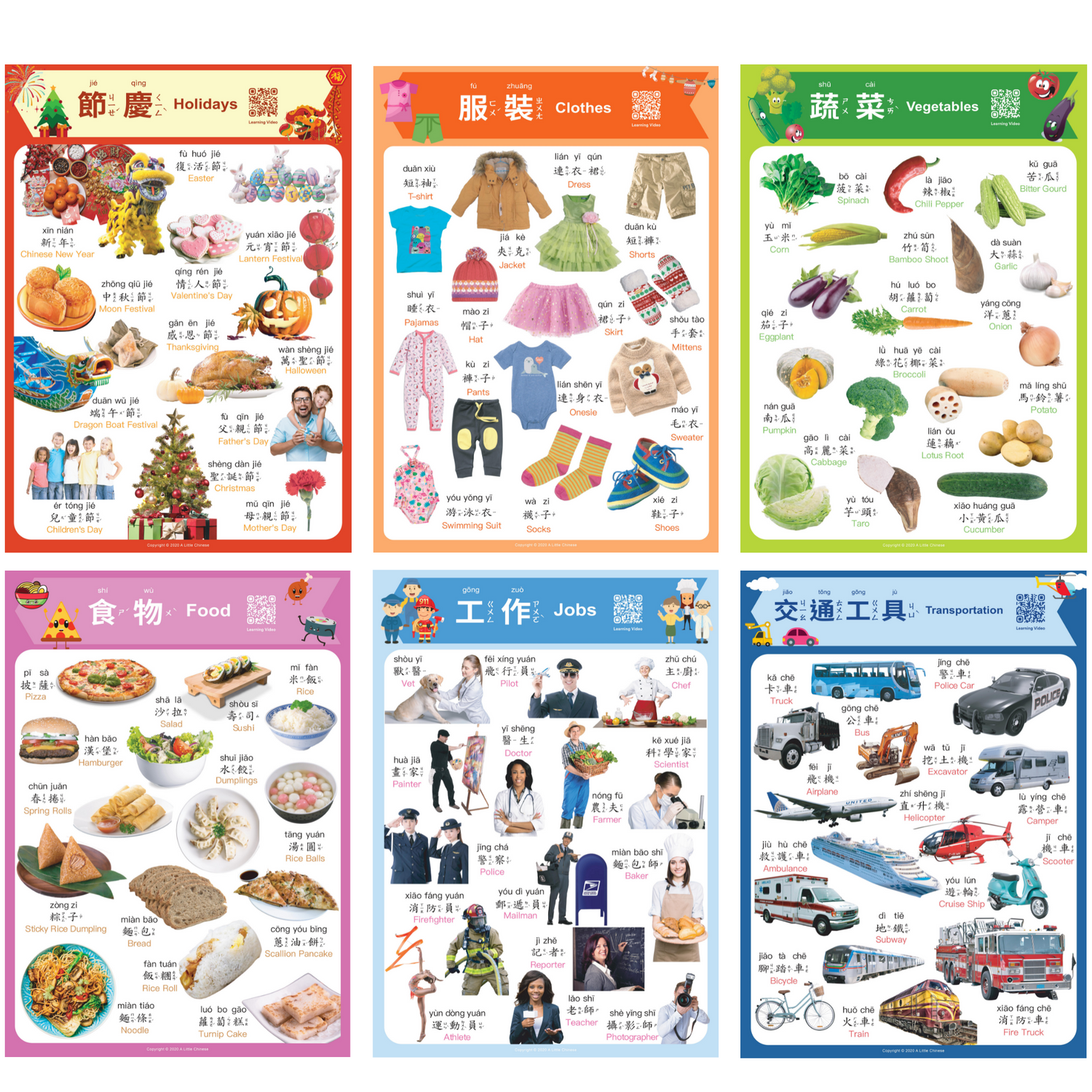 Designed by 3 moms who are extremely passionate about passing on Chinese culture and language to our kids. Each set comes with 10 posters and each poster covers a different important topic in a child’s life: Body, Jobs, Food, Transportation, Animals, Colors, Holidays, Vegetables, Clothing, Fruits.