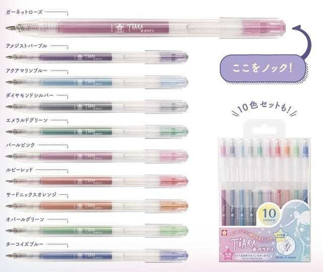 讓創作閃閃發光!這款來自日本品牌 Sakura 的 CRAY-PAS Tiara Gel Pen 是 2024 年 11 月限量發售的新品,共 10 色,每支筆皆採用閃粉水性墨水設計,靈感來自珠寶與彩妝,讓你在筆記、手帳或手作中注入亮麗風格。由經典 Gelly Roll 演化而來,Tiara 系列從傳統筆蓋改為 按壓式設計,使用更方便優雅。
