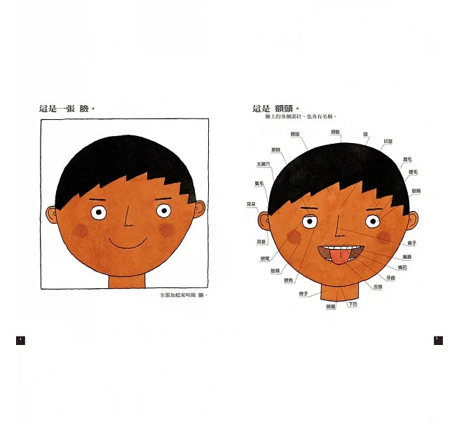 本書的編排設計層次分明,先以「花」、「臉」、「牛」為例,做整體與部分的說明,例如:一頭牛在各個部位有胸部、肚子、前後腳等不同名字,但是當它成為肉牛時,這些部位的名稱就變成了「前肋排」、「脅腹肉」與「腱子肉」了!