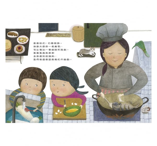 以孩子熱情參與過節,卻越幫越忙的逗趣經過,搭配時而押韻的文字,將三代同堂家庭忙碌準備過年的點滴:煮年夜飯、採買年貨、圍爐團圓、拜年守歲……描繪得有情有味,彷彿你我家中的過年片段,令人感到親切熟悉。
