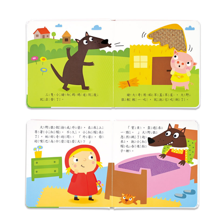 孩子可以摸到小紅帽的竹籃、壞皇后的魔鏡、三隻小豬的家……等,透過觸摸來認識童話故事,不僅增加閱讀的樂趣,也促進視覺和觸覺的感官發展。