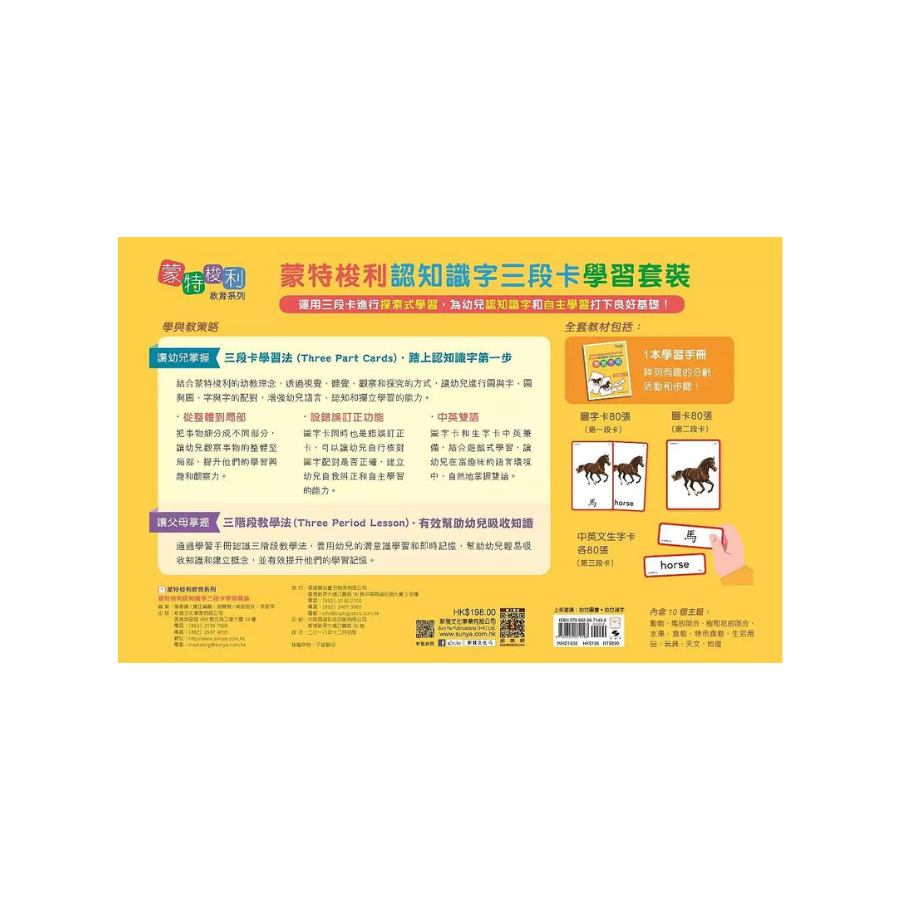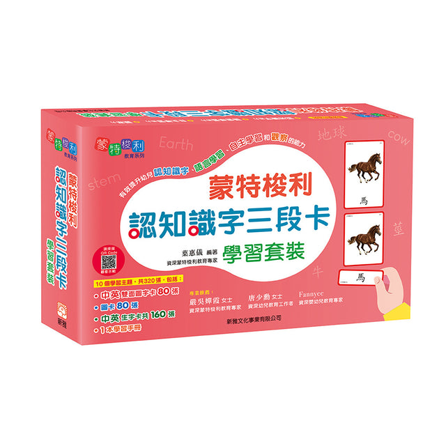 本學習套裝由資深蒙特梭利教育專家葉惠儀女士設計,讓幼兒掌握三段卡學習法 (Three Part Cards):踏上認知識字第一步。結合蒙特梭利的幼教理念,透過視覺、聽覺、觀察和探究的方式,讓幼兒進行圖與字、圖與圖、字與字的配對,增強幼兒語言、認知和獨立學習的能力!