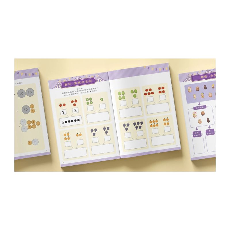 數字練習本:唱數、形狀、序數、找不同;比較大小、多寡、長短;邏輯序列、空間方位、空間對應;合成與加法、分解與減法;錢幣、時鐘、分類、先後順序。