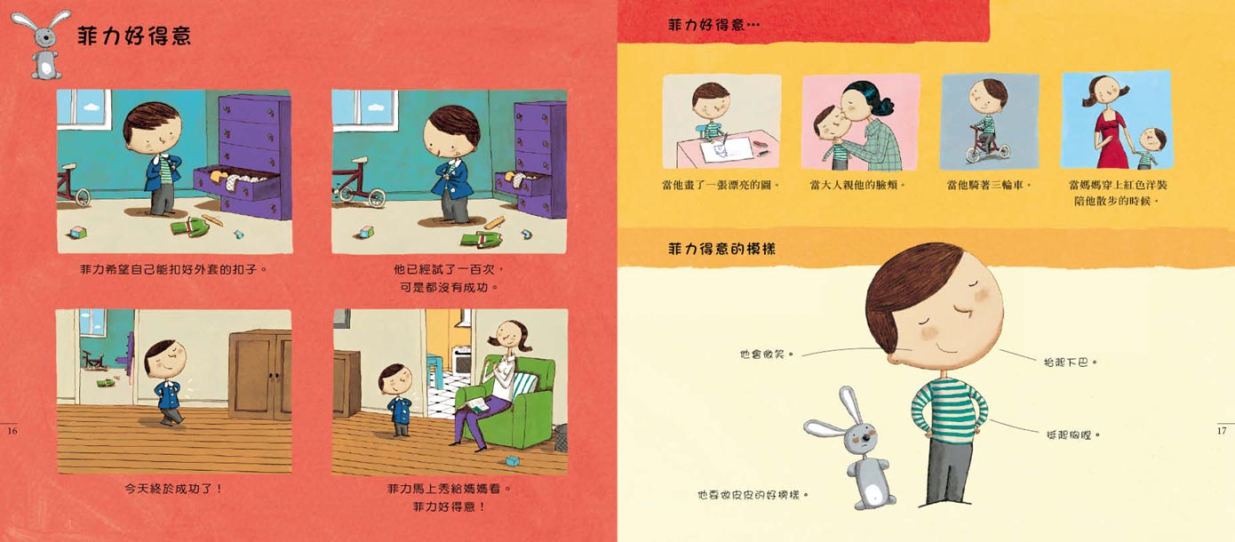 當孩子年紀小,要他們說出內心的感覺並不容易。來吧!跟著菲力和皮皮一起去發現幼兒的內心世界,不論是開心、忌妒、難過、好奇、得意、生氣、失望、害羞、無聊…