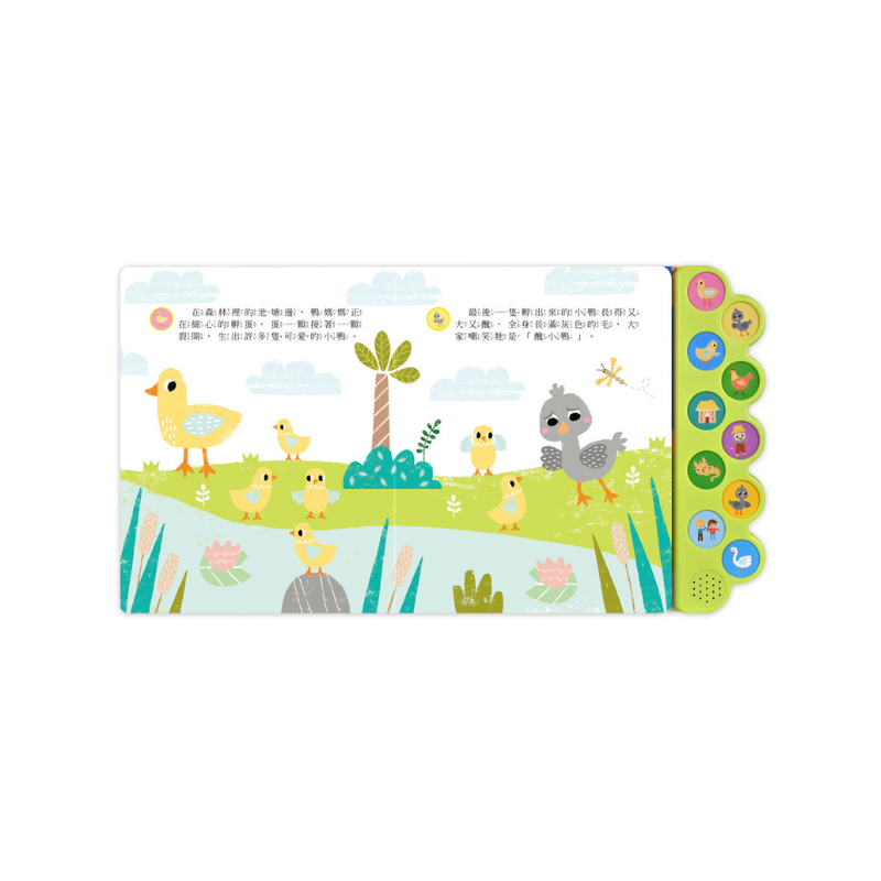 全書使用厚紙板及圓角設計,防水撕不破,安全又耐玩,簡潔的文字搭配豐富的滿版插圖,適合親子一起聽音效、說故事,建立緊密的親子關係。一起看看醜小鴨發生了什麼驚險刺激的事吧!