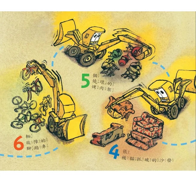 各式各樣的車輛對孩子總有一股魔力,尤其是像鏟土機這樣的工程車,更是吸引孩子的目光,畢竟能駕馭這一類的機具,看起來一定很酷!故事將鏟土機擬人化,用第一人稱描述,由鏟土機自己親口分享他一天中的工作和生活點滴,透過輕鬆活潑的語調和充滿動感的繽紛畫面,加上大量的狀聲詞,歡樂的表現出鏟土機工作的情景,散發出滿滿的活力。此外,以特殊多變的文字大小和編排方式,突顯鏟土機在畫面情境中的情緒,簡潔的文字和圖像,讀起來充滿趣味與節奏感,非常適合和孩子一起大聲朗讀和表演。