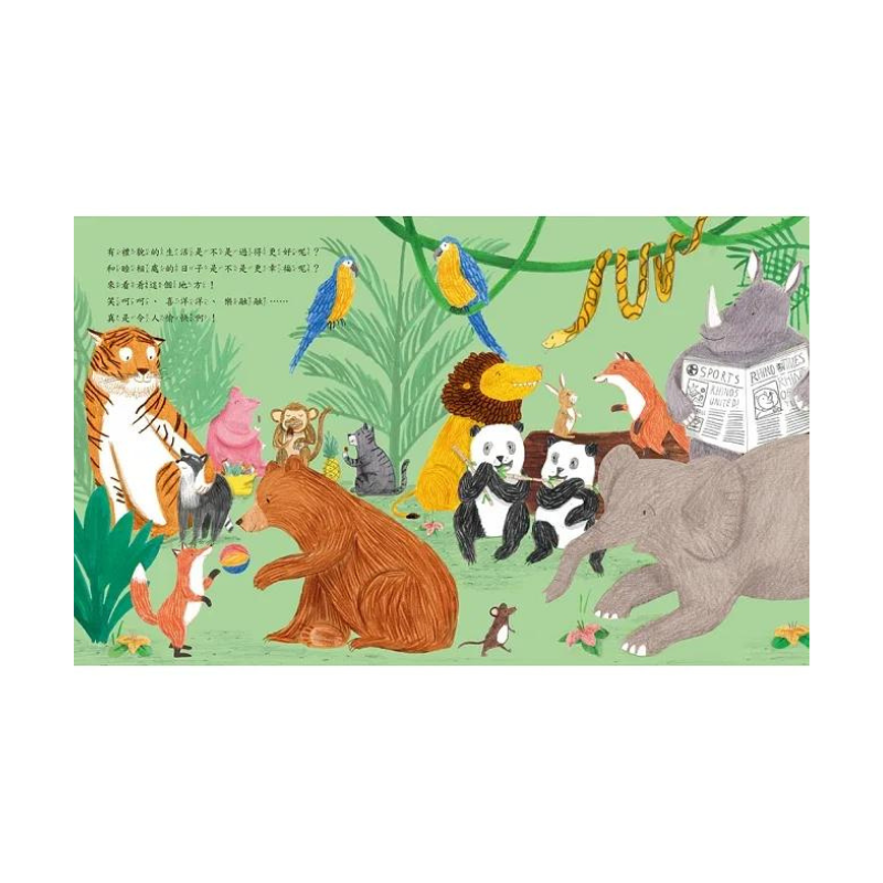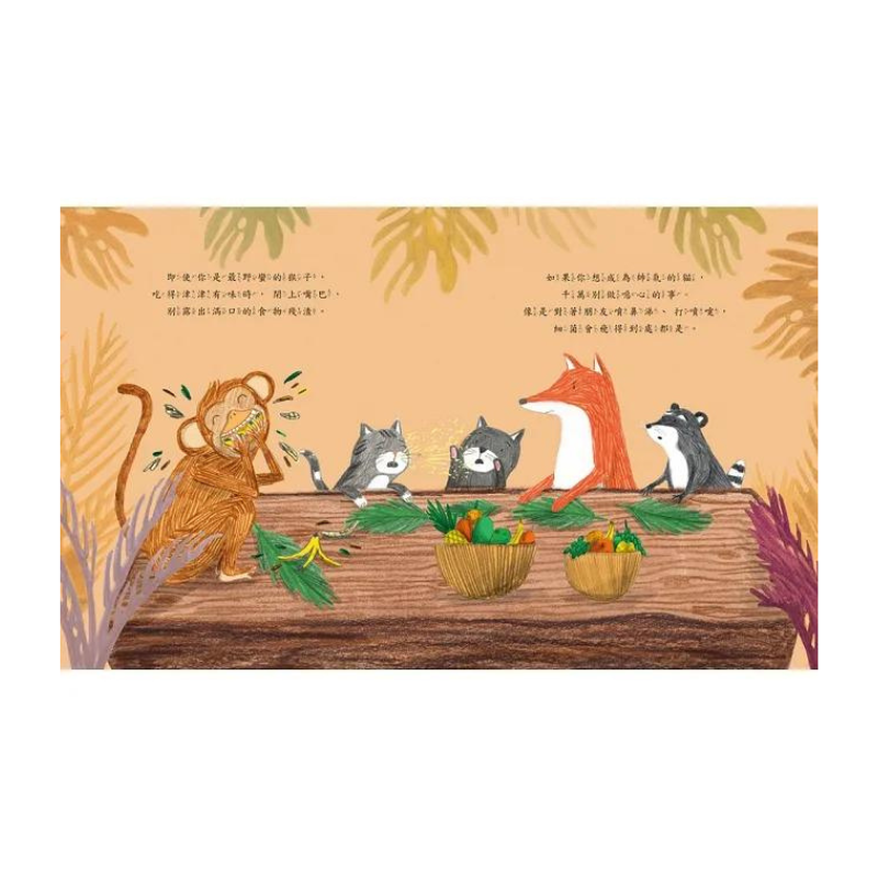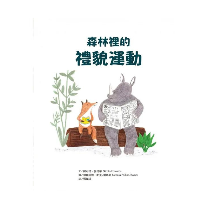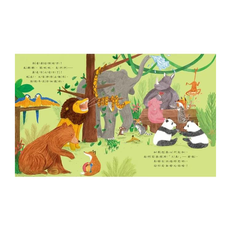 所以,就讓孩子跟著森林裡的可愛動物們一起實行「禮貌運動」吧!互相禮讓的貓熊會說「請」,收到禮物的老虎懂得微笑說「謝謝」,不小心搞砸事情的糊塗蛇有擔當的說「對不起」,大象從旁經過時輕聲說「抱歉,借過」,還有狐狸、犀牛、鸚鵡、猴子、獅子、灰熊⋯⋯也統統學會有禮貌的行為了呢!原本亂糟糟的森林終於變得快樂和諧。