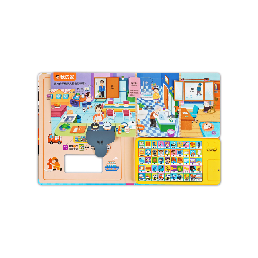 5種生活場景主題,26個精心設計的驚喜翻頁遊戲,跟著情境加深學習,給予孩子豐富的感官體驗。下方增設50個認知按鈕,按第一下生活音效,按第二下中英認知,每一列對應各頁情境主題,同時練習中英詞彙,讓知識聽得見!